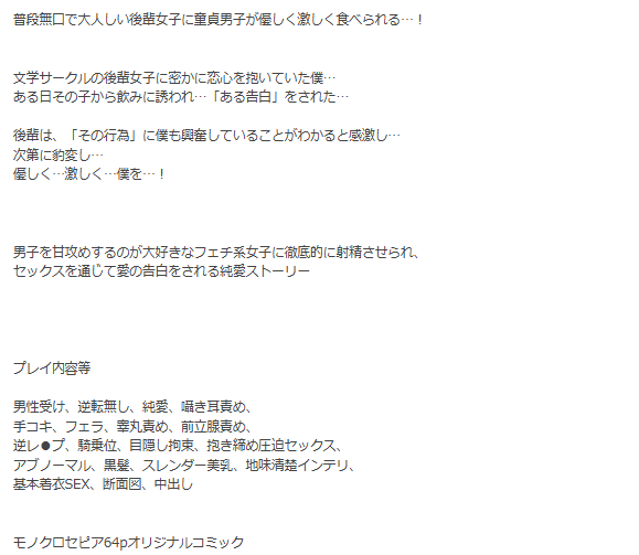今作は竿役の男子大学生が同じ文学サークルの後輩女子に食べられてしまうお話