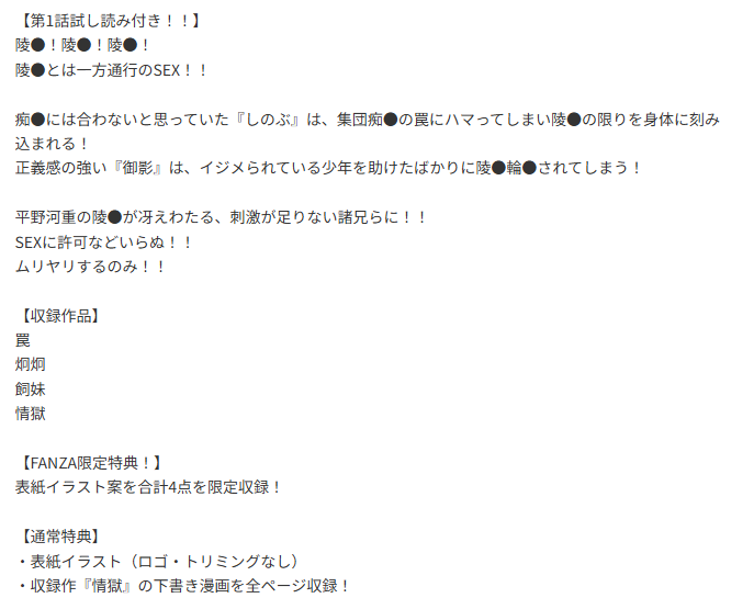 | ジャンル | 中出し/女子校生/鬼畜/処女/ 独占販売/ダーク系/先行販売 |